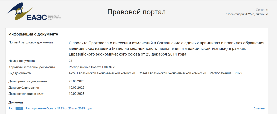 2025年9月10日,欧亚经济委员会理事会通过第23号决议,正式批准《欧亚经济联盟医疗器械流通统一原则和规则协定》修订议定书,将医疗器械过渡期整体延长两年。